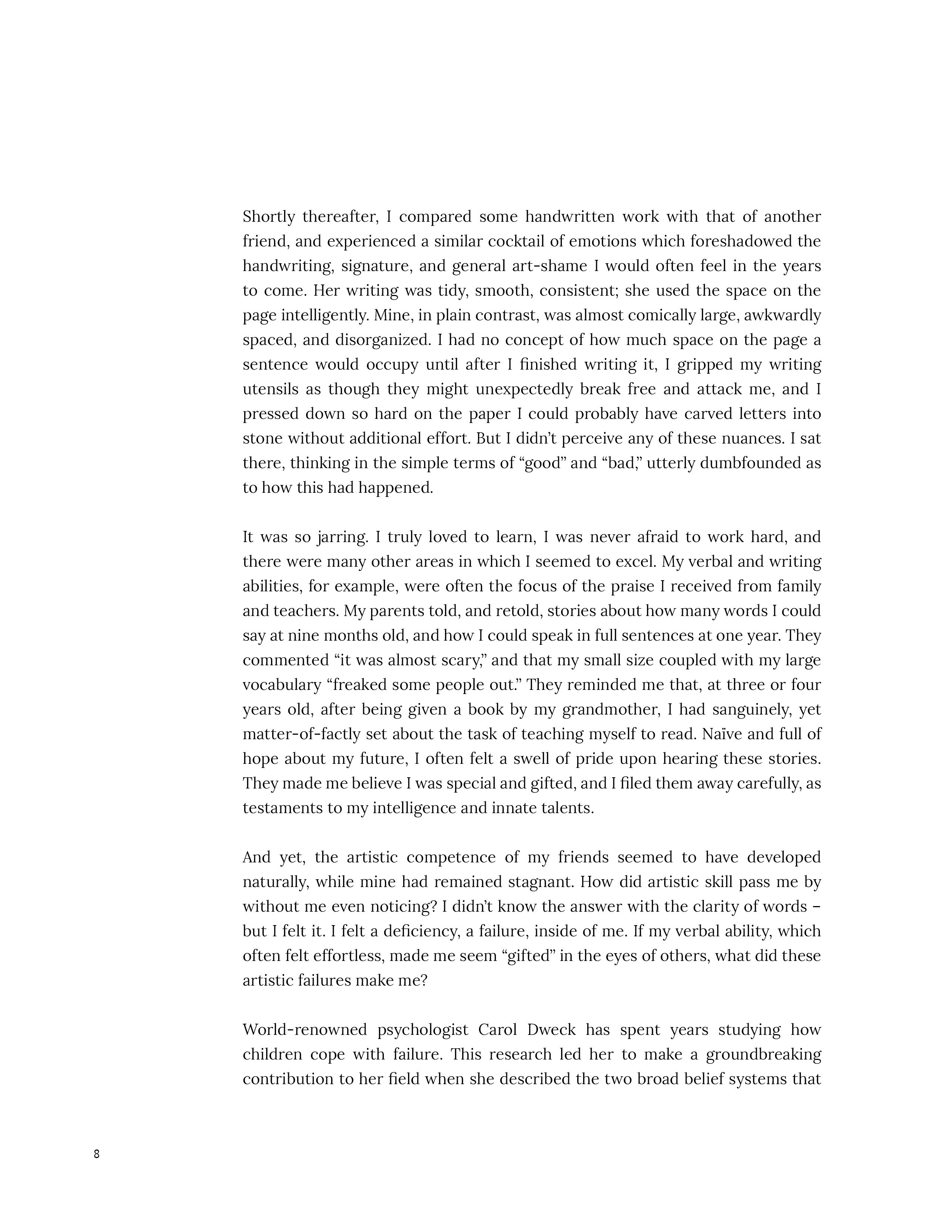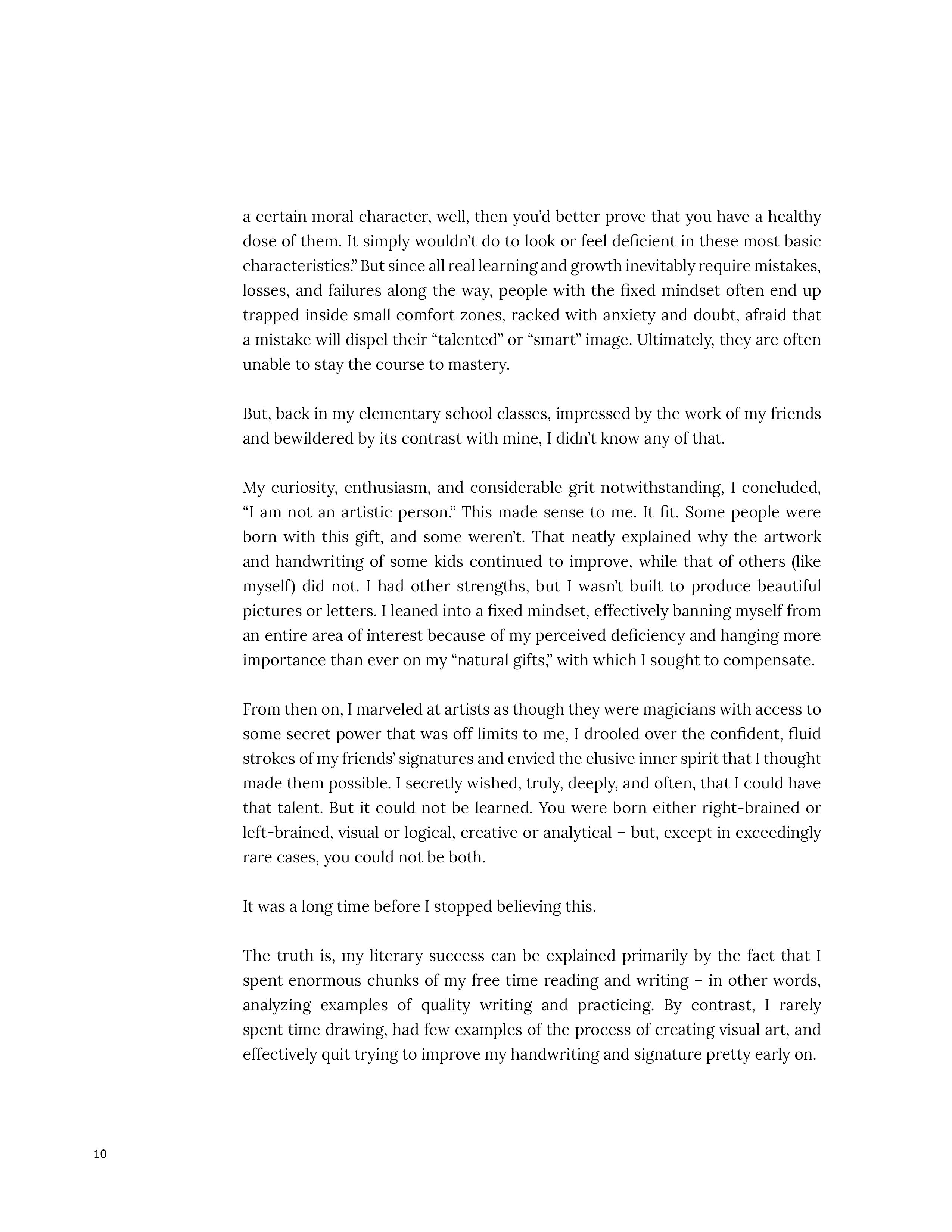 I admired and envied artists, wishing desperately to know the satisfaction of making beautiful things. But each time I tried my own hand, I saw my unpolished work as proof that I could never be artistic.